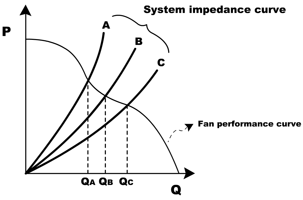 若畫成風壓與風量的關系圖,其曲線為拋物線,稱作風阻曲線(如下圖所示),由于風壓和風量有這種拋物線形的關系,只要得到一組系統(tǒng)的風壓風量值,便可得到整條的系統(tǒng)風阻曲線。